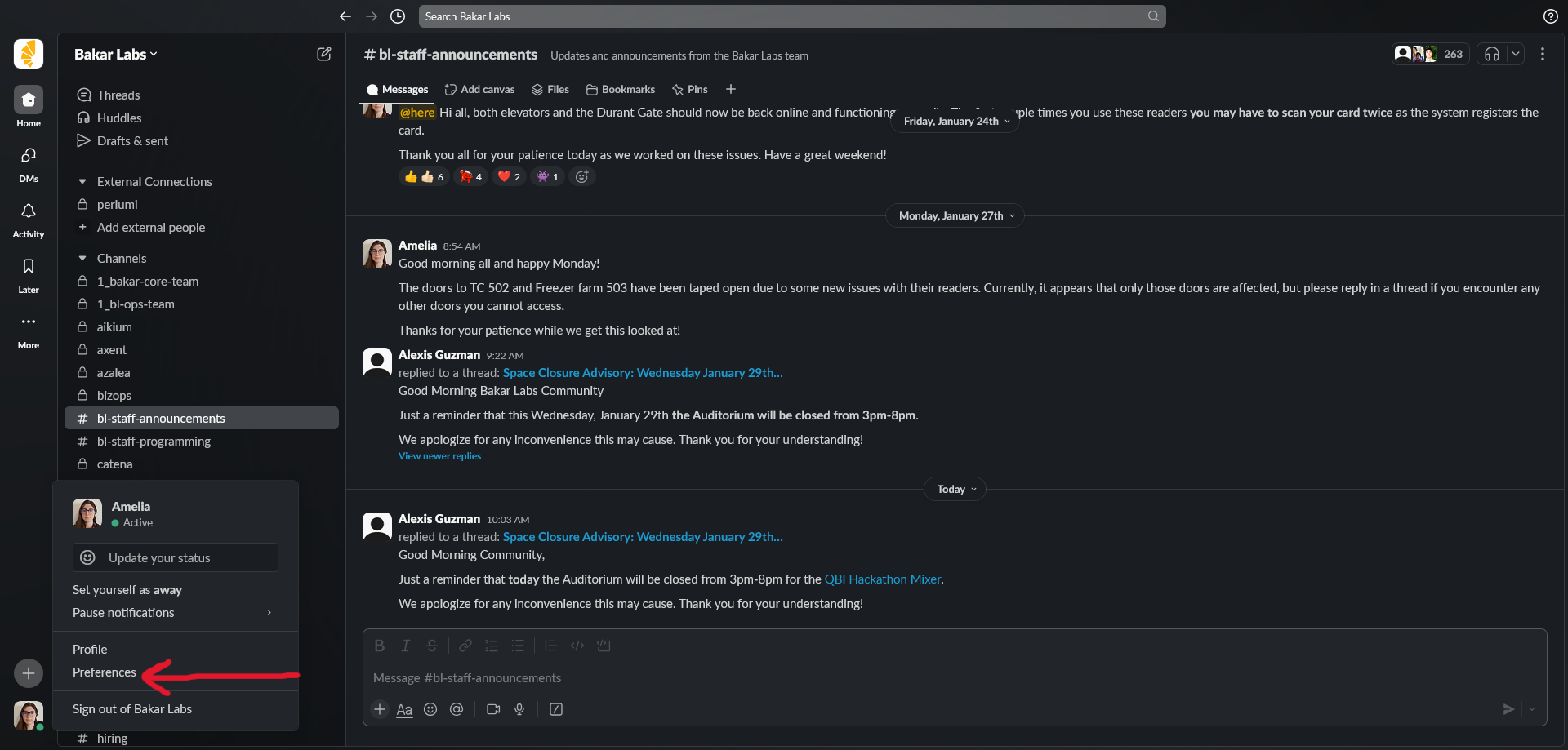 To do so, click on the icon for your profile in the bottom left corner. If you've given yourself a profile picture, it will be that picture, or it will be a colored square with your first initial. Once you've clicked on that, a menu will appear. Select "Preferences"